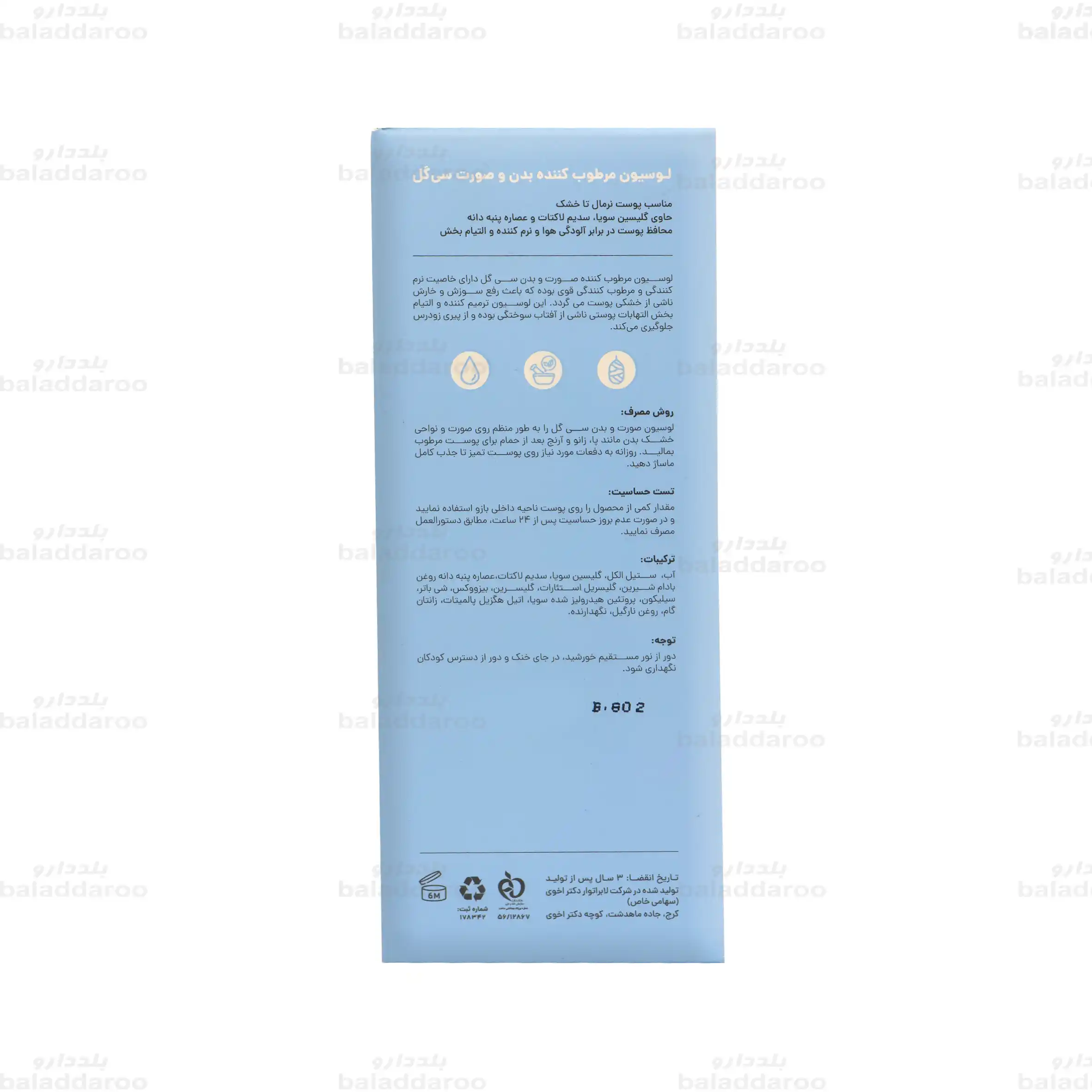 برای خرید لوسیون بدن سی گل می توانید به سایت داروخانه آنلاین بلد دارو مراجعه نمایید و پس از کسب اطلاعات درباره فرآورده و اطلاع از تاریخ انقضا، سفارش خود را ثبت نمایید. بلد دارو با پشتوانه داروخانه حقیقی و نماد تجارت الکترونیک ضمن تضمین اصالت کالاها، محصولات را بر اساس شرایط نگهداری ذکر شده روی بسته بندی نگهداری می کند. تمامی سفارشات در کوتاه ترین زمان ممکن و با بسته بندی مناسب ارسال می گردد.