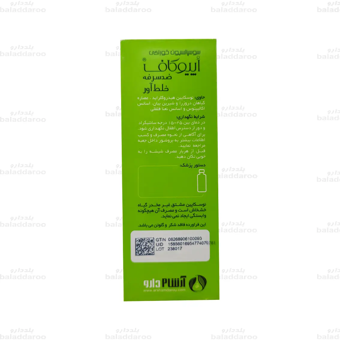 این محصول حاوی گیاه دروزرا، عصاره ریشه شیرین بیان، اسانس اکالیپتوس و نعنا فلفلی و مهم ترین ترکیب آن نوسکاپین است. این شربت در تسکین سرفه های خشک و خلط دار ناشی از سرماخوردگی و آنفولانزا، بهبود تنفس و رقیق کردن خلط مورد استفاده قرار می گیرد. این فرآورده فاقد شکر و گلوتن است.