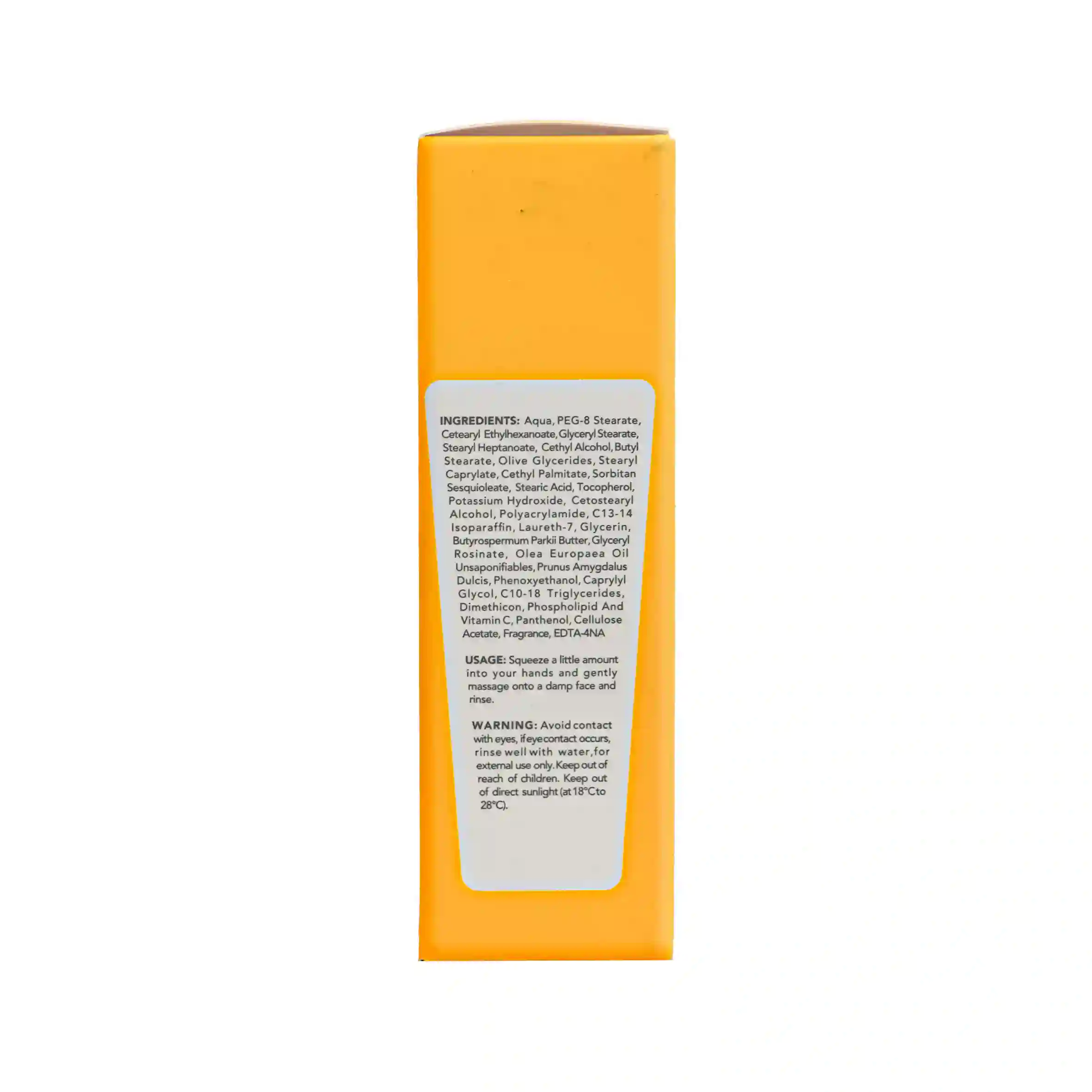 آکوا، PEG8 استئارات، سیتریل اتیل هگزونات، گلیسیریل استئارات، استریل کاپریلات، ستیل پالمیتات، گلیسیریدهای زیتون، سوربیتان سسکوئی اولتئات، استئاریک اسید، توکوفرول، پتاسیم هیدروکسید، ستوستئاریل الکل، پلی آکریل آمید، C13-14 ایزوپارافین، لورت 7، گلیسیرین، شی باتر، گلیسیریل رزینات، روغن زیتون غیر اشباع، روغن بادام شیرین، فنوکسی اتانول، کاپریلیل گلیکول، C10-18 تری گلیسیرید، دایمتیکون، فسفولیپید، ویتامین سی، پانتنول، سلولز استات، اسانس مجاز آرایشی و بهداشتی، 4-سدیم ا د ت ا.