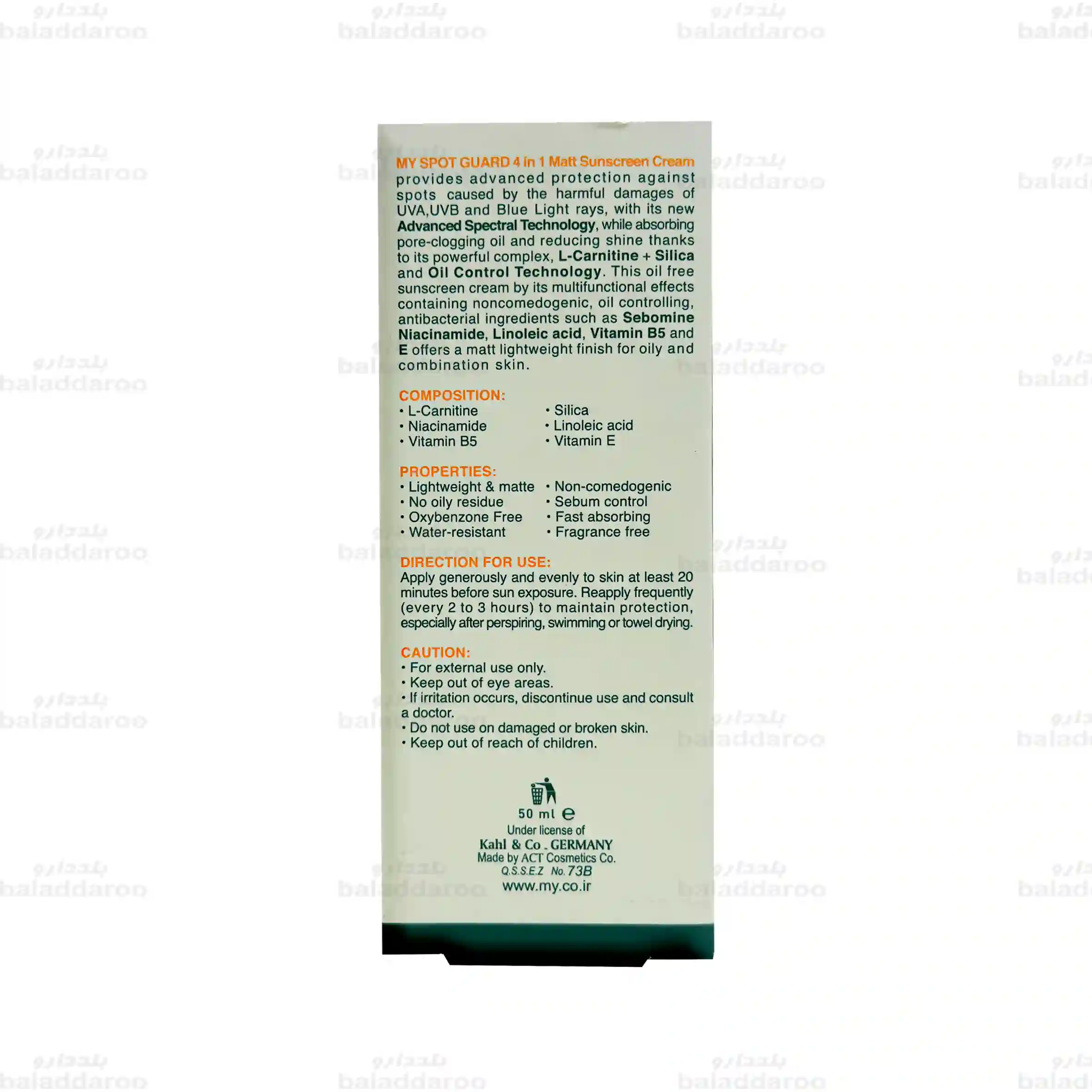 کرم ضد آفتاب اسپات گارد مات 4 کاره بی رنگ مای مناسب پوست چرب SPF50 حجم 50 میلی لیتر