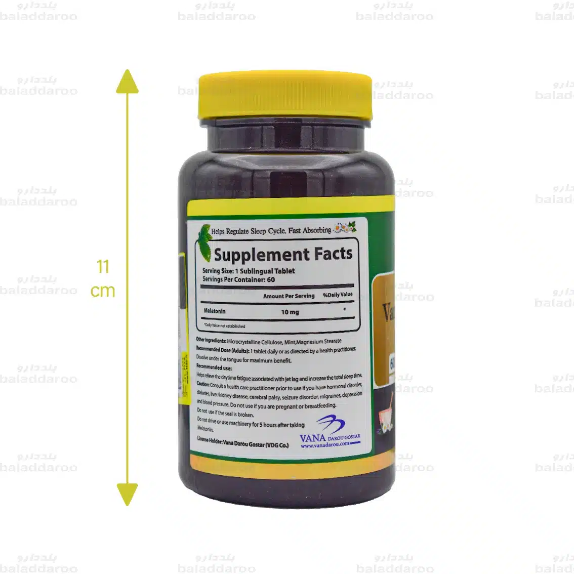 این مکمل حاوی 10 میلی گرم ملاتونین است که در تنظیم ساعات خواب نقش بسزایی ایفا می کند. این فرآورده علاوه بر تنظیم ساعت خواب، به افزایش زمان خواب، تنظیم مجدد چرخه خواب، کاهش زمان به خواب رفتن و رفع بی خوابی کمک شایانی می کند. این مکمل در شرکت وانا گستر دارو تولید می شود.