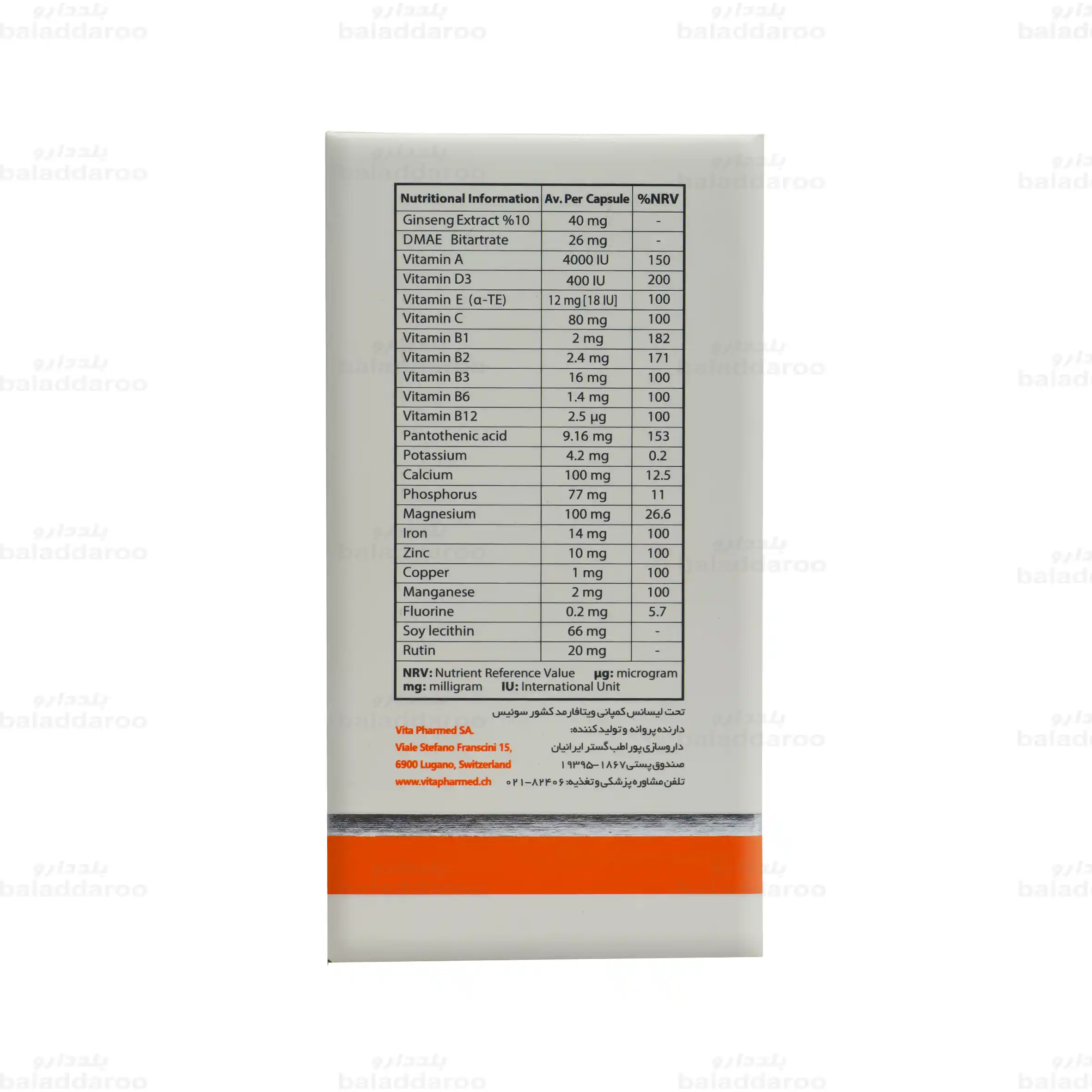 این مکمل حاوی عصاره جینسینگ، ویتامین ها و مواد معدنی است که نقش اساسی در تامین مواد مغذی مورد نیاز و حفظ سلامت عمومی بدن ایفا می کنند. این فرآورده به تقویت قوای جسمانی و سیستم ایمنی، بهبود حافظه و تمرکز، بهبود گردش خون، افزایش انرژی و حفظ سلامت استخوان ها و دندان ها کمک می کند. این مولتی ویتامین در بسته های 60 عددی تحت لیسانس ویتا فارمد سوئیس در شرکت داروسازی پوراطب گستر ایرانیان تولید می شود.